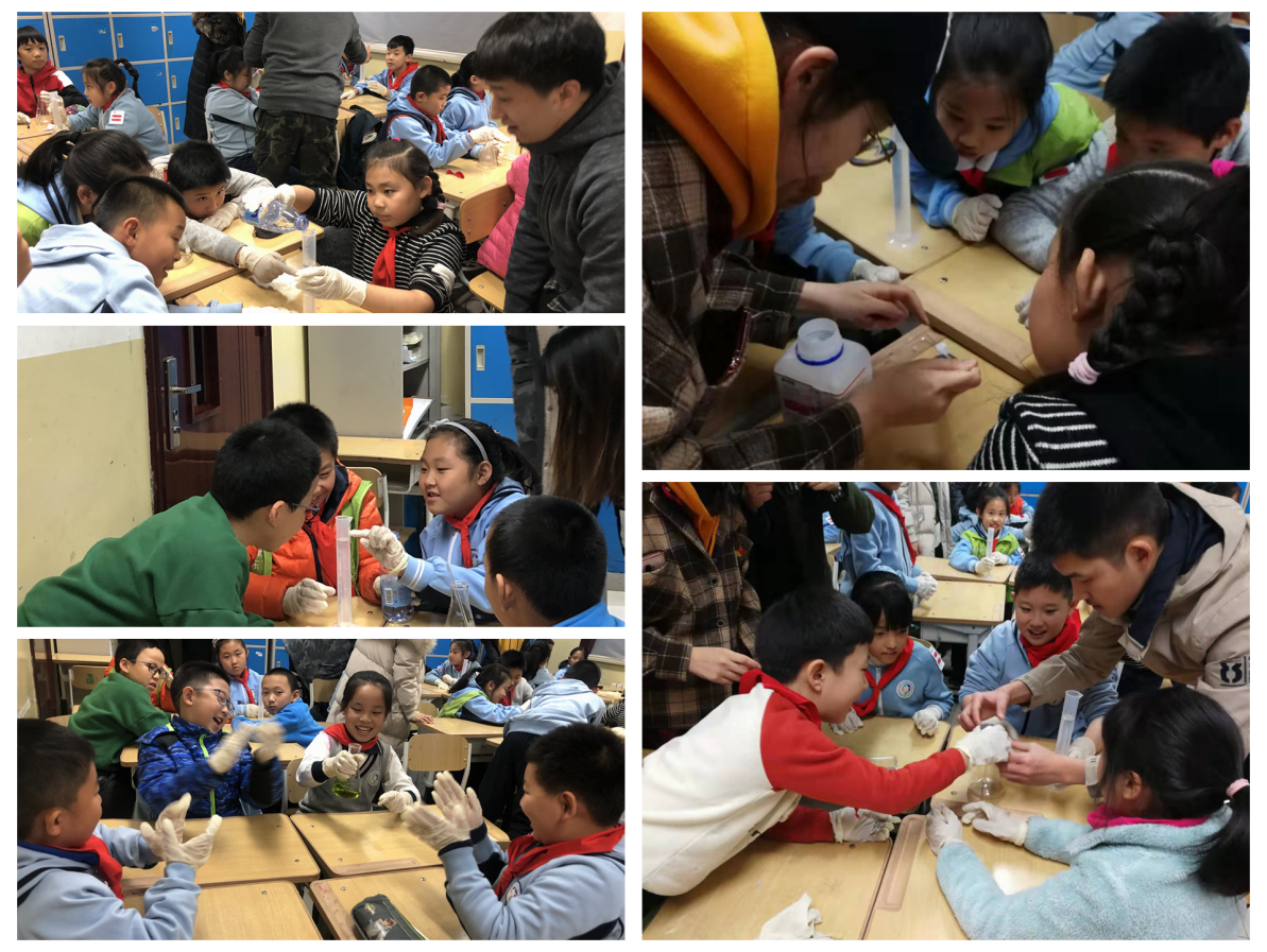 支部党员集思广益,准备了四个有趣又安全的实验——“用稀盐酸和碳酸氢钠吹气球”,“鸡蛋的沉浮”,“软硬水检测”,“红绿灯实验”,生动形象地介绍化学实验背后的原理,以及实验的具体步骤。当观察到实验现象时,小学生们一次次欢呼和尖叫,露出了惊喜的笑容,孩子们收获到了知识带来的乐趣,这也是支部党员此行最大的收获。