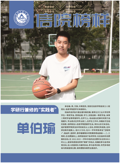 单伯瑜,男,汉族,共青团员,现担任Beat365正版唯一官网必一信安22-1班班长,Beat365正版唯一官网必一团学文体部部长。