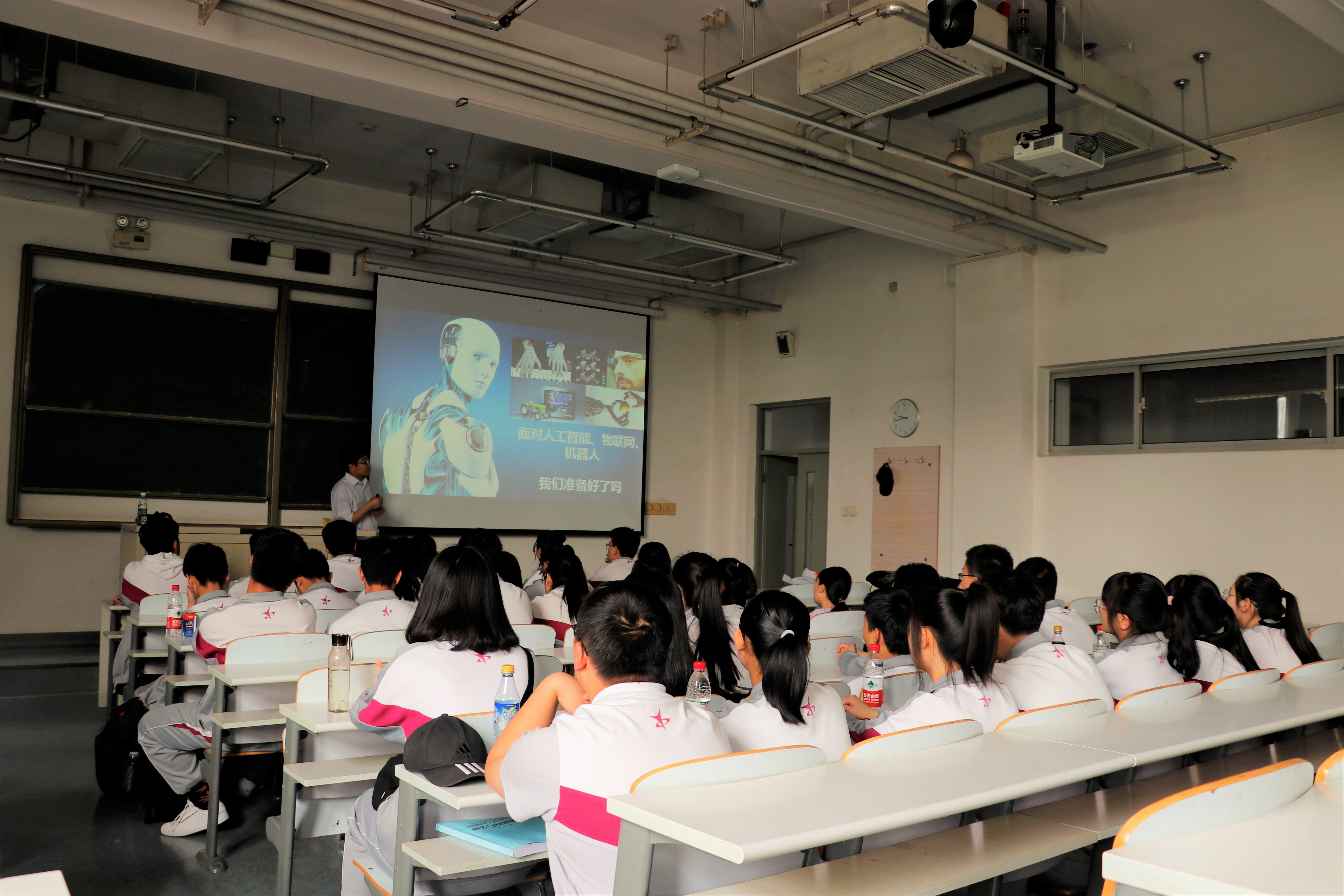 活动分为5个环节,首先,由电子工程系副主任邢志强教授为一中师生开展《智能机器人发展史》的讲座,并指导学生开展科技制作。第二环节为延庆一中校友,17级研究生吕恒宇同学为师生分享了自己的大学生活。第三环节,一中师生共同观看了Beat365正版唯一官网必一开放日展板,为提前了解专业应对新高考改革,提前做准备。第四环节,在学生志愿者的带领下,参观校园并在毓秀食堂就餐,感受大学生活。最后一个环节,在师生的讲解下,参观数字媒体和光通信实验室,进一步了解专业学习。