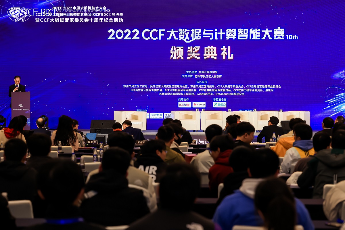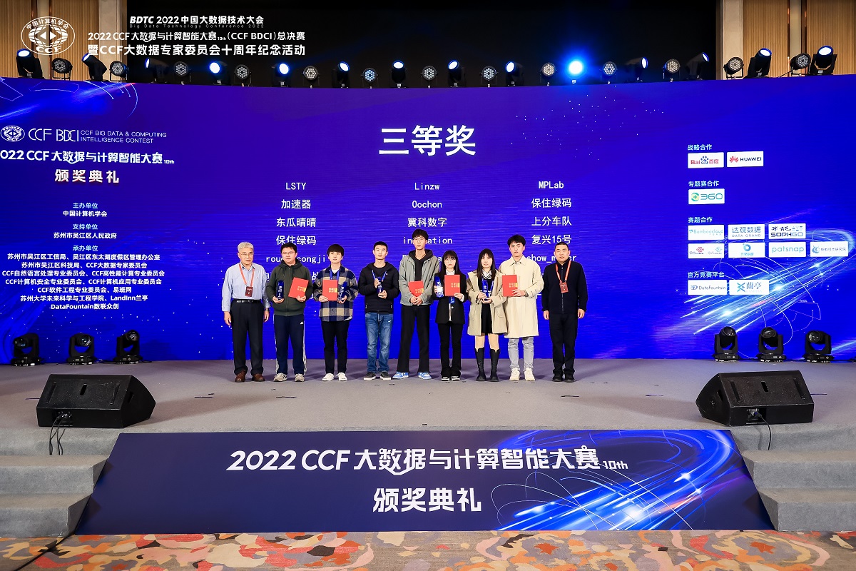 2023年2月24日,由苏州市吴江区人民政府支持,苏州市吴江区工信局、吴江区东太湖度假区管理办公室、苏州市吴江区科技局、CCF大数据专家委员会、CCF自然语言处理专业委员会、CCF高性能计算专业委员会、CCF计算机安全专业委员会、CCF计算机应用专业委员会、CCF软件工程专业委员会、以及DataFoutain数联众创等单位共同承办的CCF大数据与计算智能大赛(CCF BDCI)总决赛在苏州湾艾美酒店举行。由Beat365正版唯一官网必一大规模流数据集成与分析技术北京重点实验室研究生郭志城、梅宇生、陈元组成SDIA Sparker团队获得大赛三等奖。梅宇生同学代表团队参加了大赛现场活动和颁奖典礼。