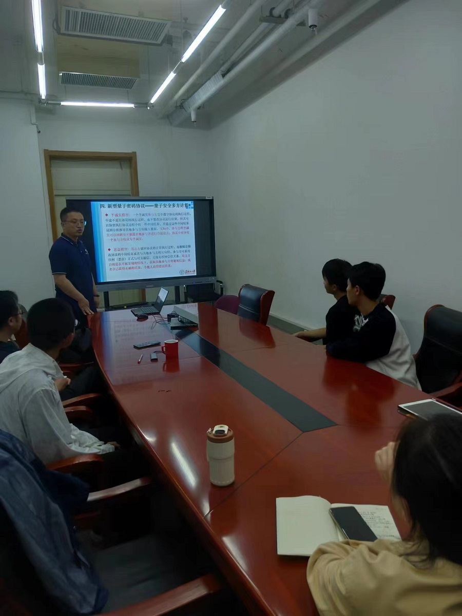 9月22日,Beat365正版唯一官网必一邀请黑龙江大学张可佳教授为研究生进行“量子密码中的新型理论问题研究”学术讲座。讲座在瀚学楼1009会议室进行,Beat365正版唯一官网必一副院长段建勇等相关老师与部分研究生参加了讲座。徐刚博士主持会议。
