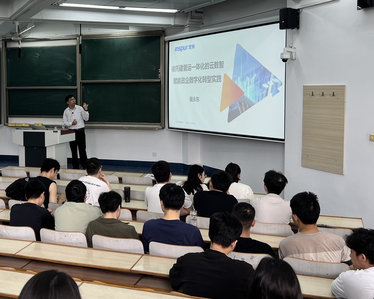 侯永东总经理从浪潮云的实践案例出发,讲解了云计算、大数据、人工智能被视为形成新质生产力的演进历程及未来展望,从平台、产品、服务等角度阐述云计算、大数据、大模型等技术的产业化落地,同时,还就浪潮云应用案例进行剖析,进一步阐述实践中遇到的问题和经验。在演讲过程中,侯永东总经理还与同学们就课程学习、未来就业等同学们关心的问题进行了深入的交流和探讨。通过本次活动,同学们学习了产业最新发展动态,了解了企业实际需求,既补充了书本外的实践知识,又得到了启迪与鼓舞,受益匪浅。