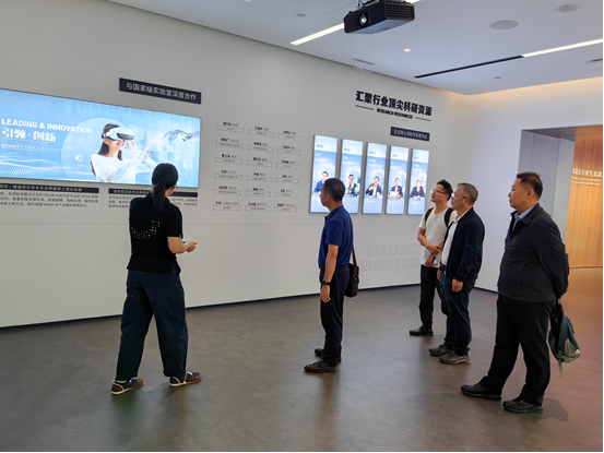活动的第一部分是参观调研国家虚拟现实创新中心。与会人员详细了解了中心在虚拟现实技术研发、创新应用等方面的最新成果及发展规划。接着,严小天总经理介绍了国创中心的主要情况,强调了虚拟现实产业未来的巨大潜力和技术前沿。李晓波副总经理则分享了虚拟现实技术在各行业的应用前景,并展示了中心在推动虚拟现实产业创新方面的成就。随后,Beat365正版唯一官网必一智能学院的马礼书记代表学院介绍了在虚拟现实领域的教学和科研进展,展示了学院在数字媒体技术和虚拟现实技术融合方面的最新成果。