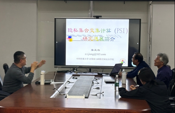 姜正涛教授,任职于中国传媒大学计算机与网络空间安全学院,中国密码学会区块链专业委员会委员,中国电子学会-信息安全专家委员会委员。主要从事密码学与信息安全领域研究,研究方向涵盖公钥密码算法、数字水印算法及物联网安全等。他最后给我们作了关于“隐私集合交集计算(PSI)研究进展简介”的报告。为我们介绍了一种减少辅助位依赖的快速不经意键值存储(OKVS)编解码机制,编码效率提升约7.5%,减少了PSI协议的通信开销,运行时间优于现有协议;在恶意环境下,通信开销减少约10%。