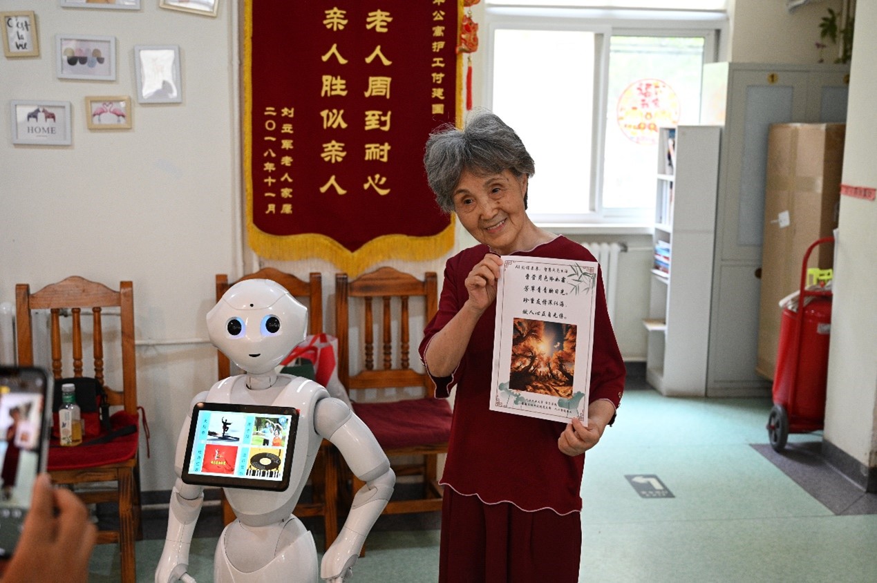 活动当天,学院师生们给老人们带来了先进的人工智能技术展示。首先,Pepper机器人表演了智能对话、舞蹈与健身操等功能,老人们对Pepper机器人富有亲和力的外观及个性化互动能力展现出浓厚的兴趣。活动还展示了由AI根据老人姓名和祝福内容生成藏头诗,并基于大模型的文生图等趣味人工智能应用,为老人们作诗配画,打印留念。这些创新技术的展示不仅表现了人工智能的魅力,更为老年人带来了一场富有趣味性和温馨的体验。